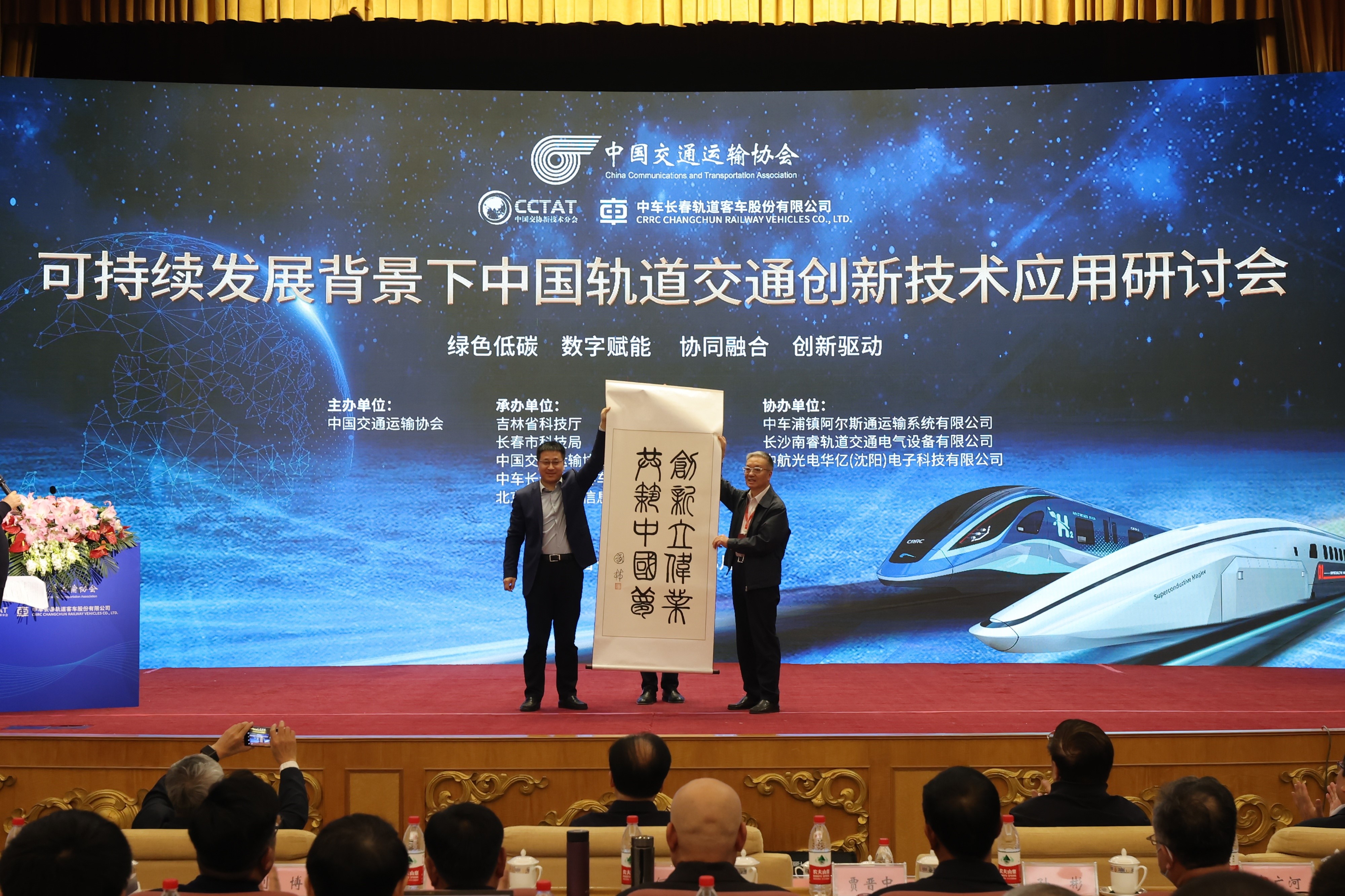 开幕式上,第十三届全国政协常委、民革中央原副主席修福金与中国交通运输协会副会长钟华代表中国交通运输协会,分别向本次会议的承办单位吉林省科学技术厅、长春市科学技术局、中车长客股份公司赠送书法作品。