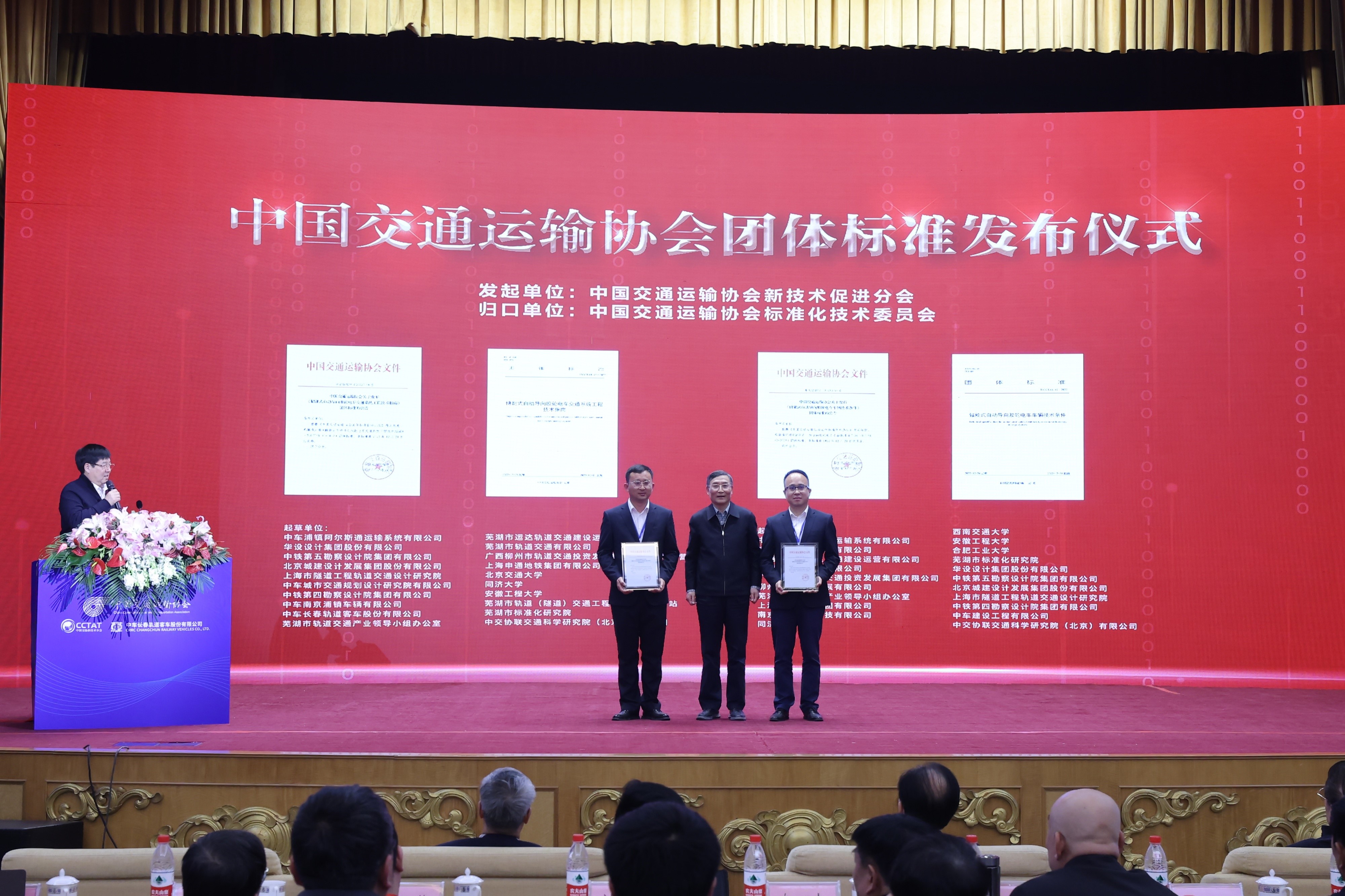 在协会团体标准发布仪式上,中国交通运输协会副会长兼秘书长、交通运输部政策研究室原主任、协会标准化技术委员会主任委员李刚发表致辞,并向由新技术促进分会发起的《储能式自动导向胶轮电车车辆技术条件》《储能式自动导向胶轮电车交通系统工程技术指南》标准起草单位代表中车浦镇阿尔斯通运输系统有限公司颁发标准发布公告和文本。